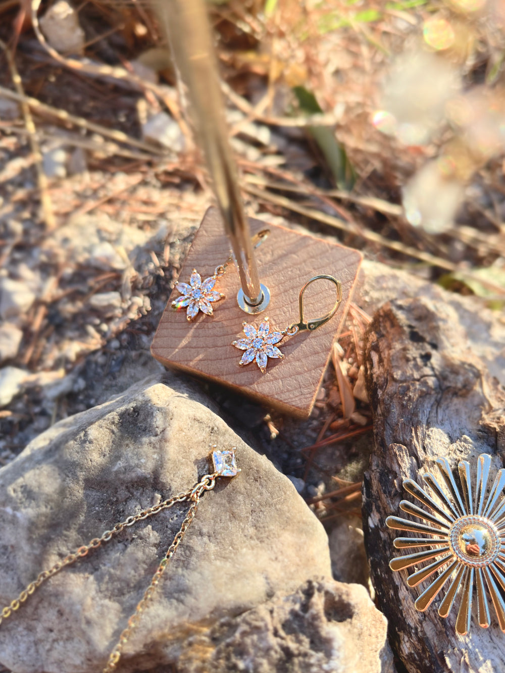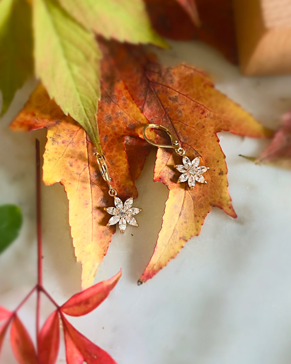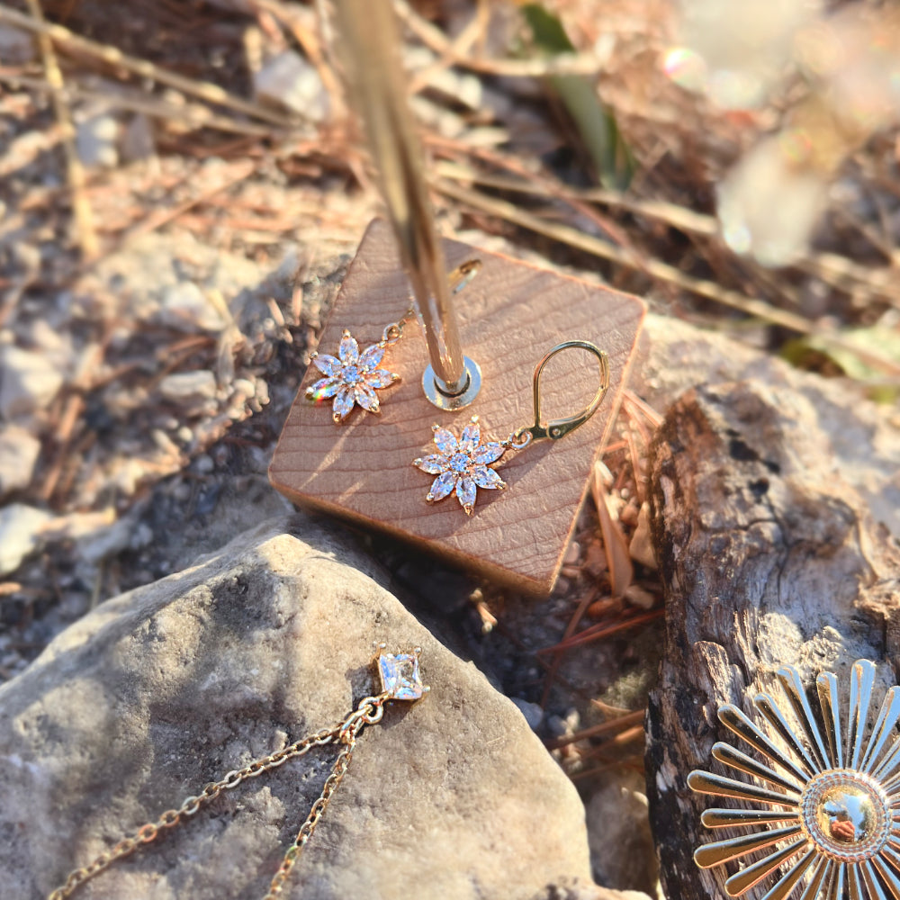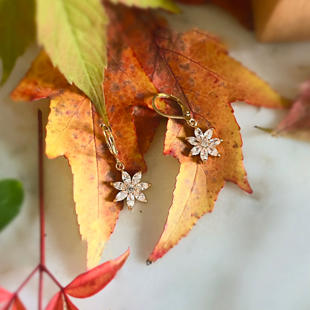 Boucles d'oreilles dorées à l'or fin, fleur de zirconium