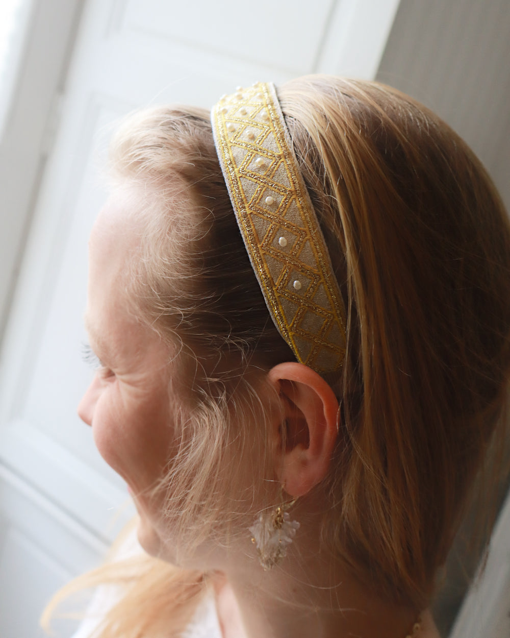 Le serre-tête Hildegarde d'inspiration médiévale présente un magnifique galon beige rehaussé de jaune soleil et d'or sur lequel sont brodées à la main plus de 30 véritables perles d'eau douce. Il sublime une petite robe noire comme une robe de mariée.
