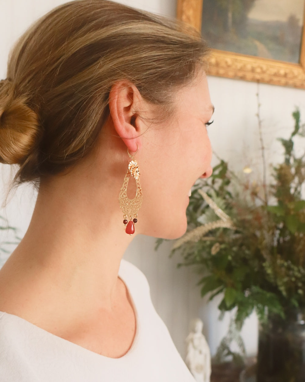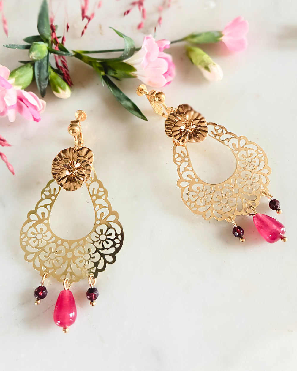 Boucles d'oreilles dorées à l'or fin agates et grenats