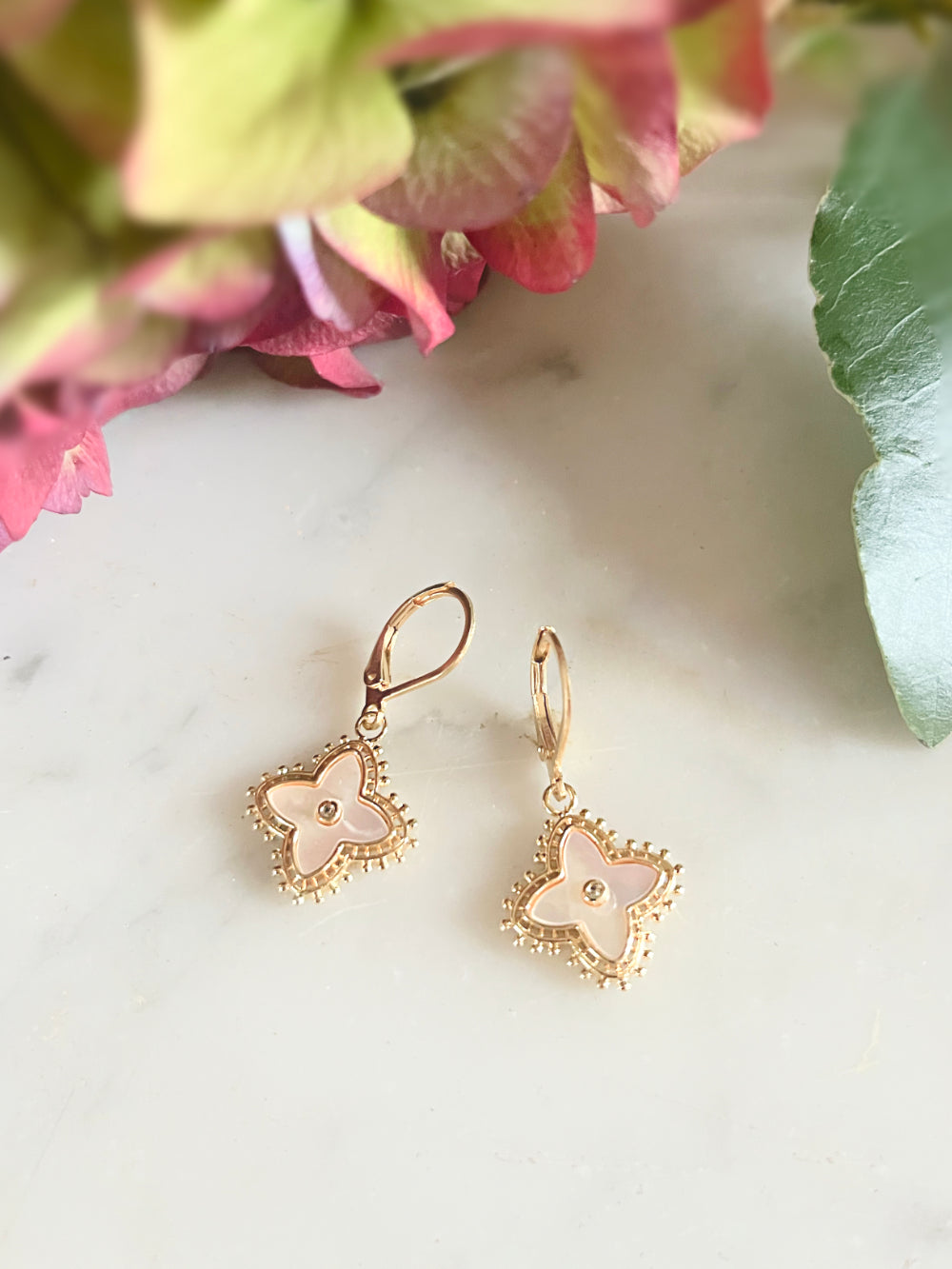 Boucles d'oreilles dorées à l'or fin nacre et zirconium